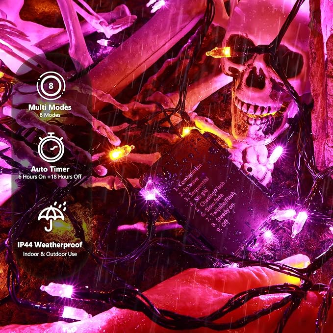 - 8 Modes & Auto Timer: These purple+orange halloween string lights have 8 gorgeous lighting modes with built-in auto-timer 6 hours "ON" and 18 hours "OFF", which starts once you activate any one of the 8 modes on the battery holder, so it will automatically time when the light is on. Note: If you change modes before the timer expires then it will stay on that mode for another 6 hours.