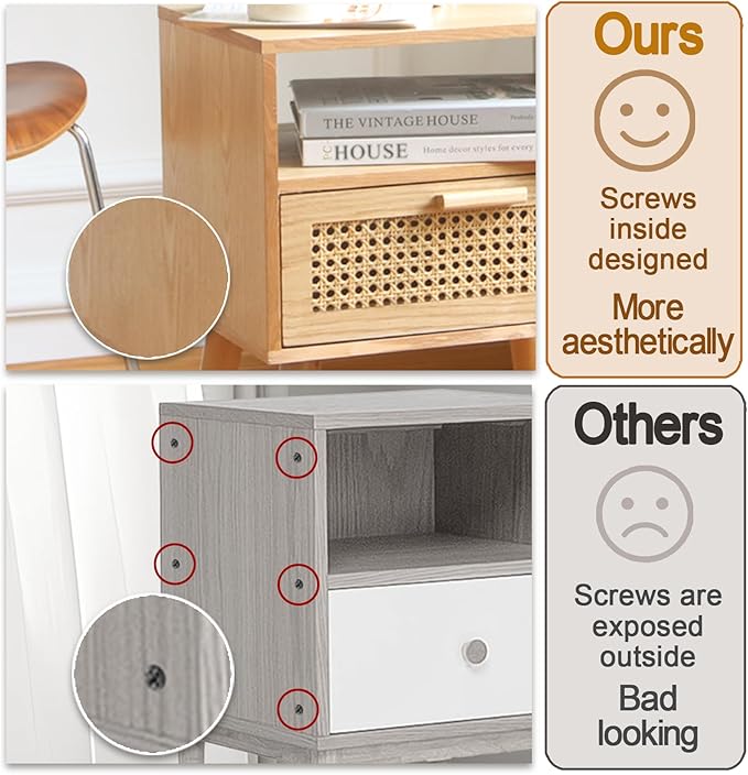 - Stylish and Practical Storage: The bedside table features a two-tier storage design, a unique extra top shelf and a spacious tabletop with a natural rattan drawer to fit your snug home and provide more space to put down books, snacks, drinks