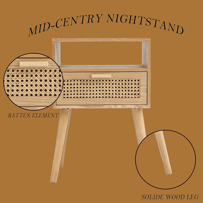 MaxSmeo Modern Nightstand Rattan Side End Table with Storage, for Living Room, Bedroom and Small Spaces, Accent Bedside Farmhouse Tables with Solid Wood Legs, Easy Assembly (Natural Walnut)