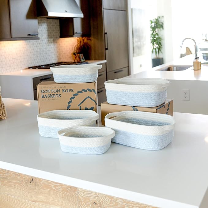 NaturalCozy 5-Piece Rectangle Storage Basket Set- Natural Cotton Rope Woven Baskets for Organizing! Small Basket for Montessori, Baby Nursery, Dog Toy Baskets, Cat Toy Box, Bathroom Organization Bin