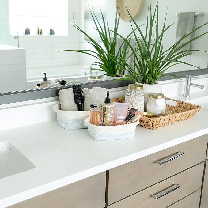 - 5 BASKETS FOR 5X THE ORGANIZING POWER: Life is messy...but your house doesn’t have to be! With 5 beautiful rope baskets for organizing, you’ll defeat messy rooms like a true supermom! Use the largest baskets for Montessori displays or countertop fruits holder, create the cutest dog toy storage or bathroom hand towel holder with the medium ones and stash jewelry or keys in the smallest. Biggest (11.8"x8.7"x4.3"), (11"x7.9"x3.9"), (10.2"x7.1"x3.5"), (9.1"x6.3"x3.1"), Smallest (7.9x5.5"x2.8")