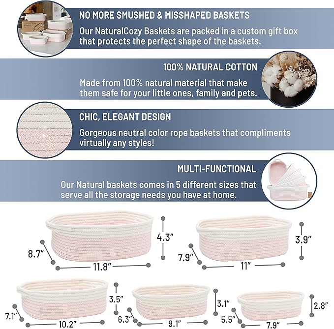 - 5 BASKETS FOR 5X THE ORGANIZING POWER: Life is messy...but your house doesn’t have to be! With 5 beautiful rope baskets for organizing, you’ll defeat messy rooms like a true supermom! Use the largest baskets for Montessori displays or countertop fruits holder, create the cutest dog toy storage or bathroom hand towel holder with the medium ones and stash jewelry or keys in the smallest. Biggest (11.8"x8.7"x4.3"), (11"x7.9"x3.9"), (10.2"x7.1"x3.5"), (9.1"x6.3"x3.1"), Smallest (7.9x5.5"x2.8")