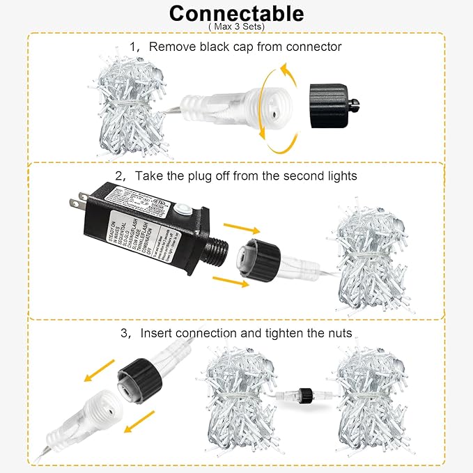 - Low Voltage & UL Certification: The output voltage of the twinkle lights is 29V, the power of adapter is 6W with UL certified, energy saving and safe to use. The Christmas outdoor lights will not overheat even after working for a long time and safe to touch.