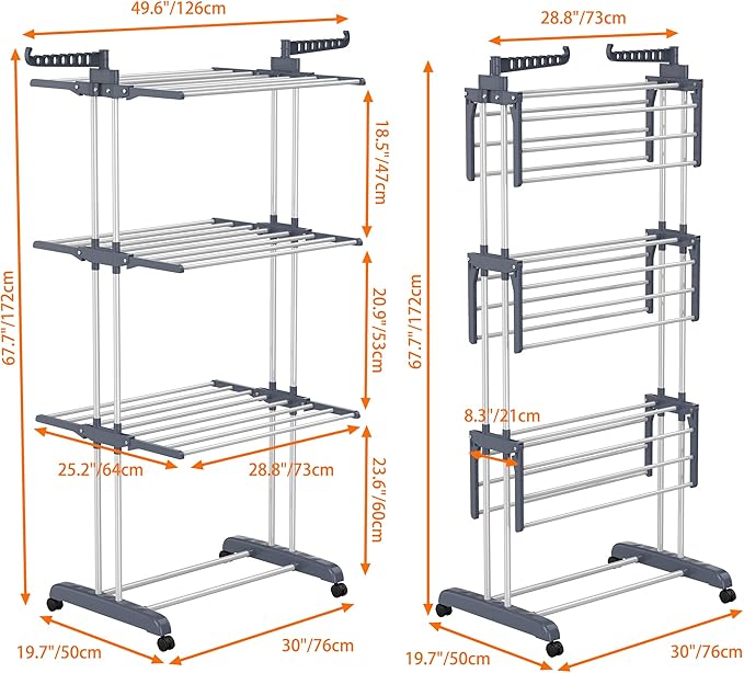 - 【4-TIER Oversized Clothes Drying Rack】: Size: 67.7H x 19.7W x 30L Inches. Oversized 4-tier design and 2 wing hooks for drying towels, socks, clothes, shoes, quilts, etc. There are a total of 24 pillars, 14 hooks on 2 side wings for additional hanging drying. Oversized drying rack for drying up to 62 clothes. There is enough space to dry whole family's clothes.