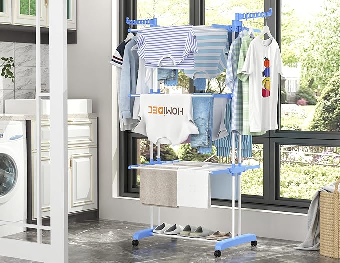 HOMIDEC Clothes Drying Rack, Large 4-Tier Foldable Drying Rack Clothing(67.7H x 19.7W x 30L Inches), Movable Drying Rack with 4 castors. Multifunctional Stainless Steel Laundry Drying Rack, Blue