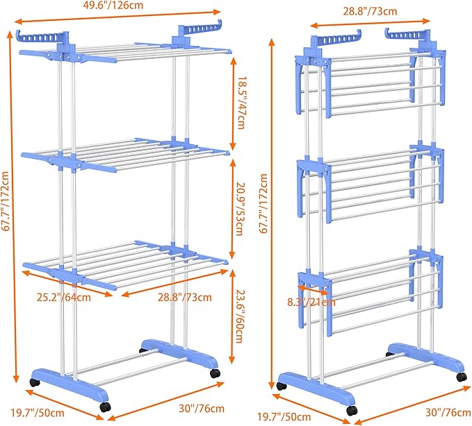 - 【4-TIER Oversized Clothes Drying Rack】: Size: 67.7H x 19.7W x 30L Inches. Oversized 4-tier design and 2 wing hooks for drying towels, socks, clothes, shoes, quilts, etc. There are a total of 24 pillars, 14 hooks on 2 side wings for additional hanging drying. Oversized drying rack for drying up to 62 clothes. There is enough space to dry whole family's clothes.