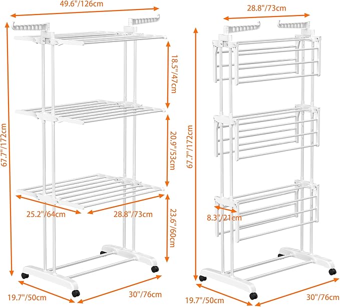 - 【4-TIER Oversized Clothes Drying Rack】: Size: 67.7H x 19.7W x 30L Inches. Oversized 4-tier design and 2 wing hooks for drying towels, socks, clothes, shoes, quilts, etc. There are a total of 24 pillars, 14 hooks on 2 side wings for additional hanging drying. Oversized drying rack for drying up to 62 clothes. There is enough space to dry whole family's clothes.