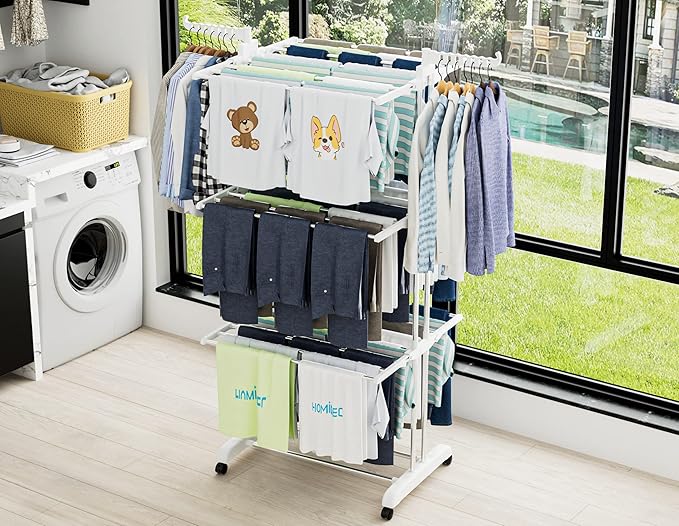 HOMIDEC Clothes Drying Rack, Large 4-Tier Foldable Drying Rack Clothing(67.7H x 19.7W x 30L Inches), Movable Drying Rack with 4 castors. Multifunctional Stainless Steel Laundry Drying Rack, White
