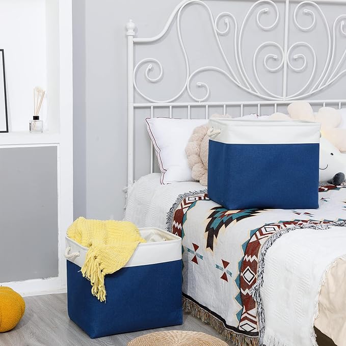 Bidtakay Large Canvas Organization Bins Set of 2 Navy Blue Rectangular Baskets 17x12x15 in for Blankets, Clothes, Towels, Dog Toys Storage