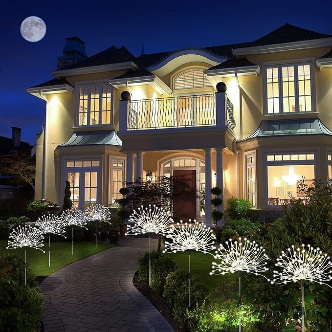 - [Upgraded Creative Waterproof Garden Light] Each solar yard light adopts 30 flexible high-quality copper wire and 120 led beads, which can be easily bent into any shape you like, such as fireworks, flowers, ferries wheel, and heart shapes. These outdoor ornaments have colorful lights, they illuminate the flower bed, pathways, lawn, driveway, camping grounds, parties to create a festive and romantic atmosphere.