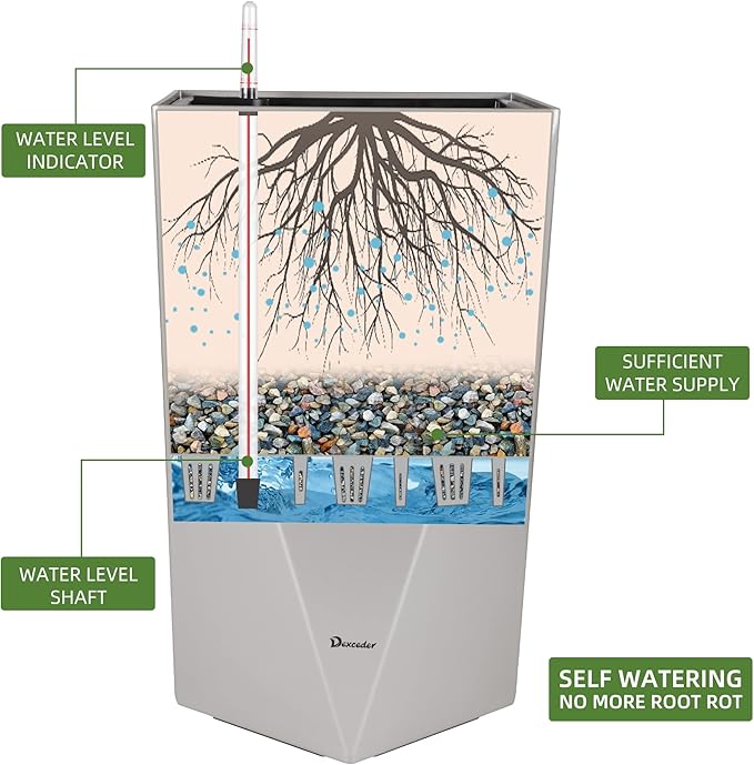 - SELF WATERING & NO MORE ROOT ROT - The smart unique sub-irrigation system is one of the most appealing aspects among all Dexceder planters. The easy-to-use separated integrated water reservoir or catcher- keeps your soil well aerated and automatic supplies plants with the right amount of ongoing moist air & nutrition for optimal growth. The insert indicator shows you the exact time to water again. The full water supply period can single-handedly last over 1 month based on different live plants