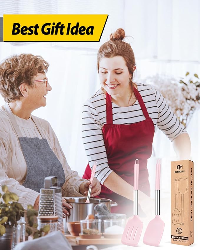 Pack of 2 Silicone Solid Turner, Non Stick Slotted Kitchen Spatulas, High Heat Resistant BPA Free Cooking Utensils, Ideal Cookware for Fish, Eggs, Pancakes(Pink)