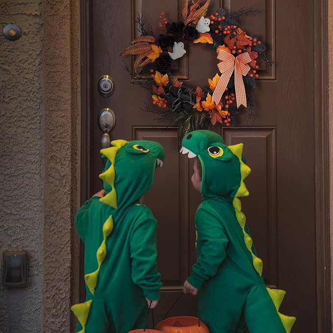 - Unique Halloween Wreath: Our front door Halloween wreath is handmaded on a grapevine base, decorated with white ghost, artificial rose flowers, feathers and ribbon bowknot. Black rattan base and twisty twigs give a spooky vibe. White ghost and orange bowknot add cuteness to the wreath.