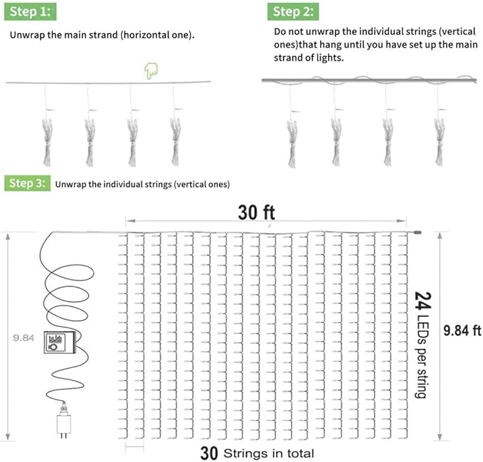 - [30 ft x 10 ft Curtain Lights] Boasting 720 Cool White LED lights, 3-4 times wider than others, making it ideal for outdoor decor. The product has an IP44 weatherproof rating, but please ensure you protect the plug and controller, as they are not waterproof. (please Note: they are NOT connectable)
