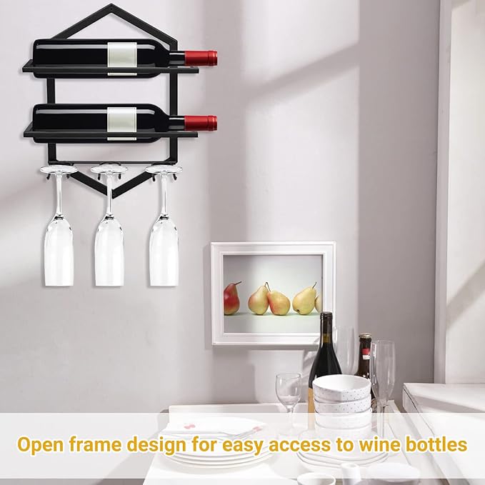 - 【2-IN-1 Wine Display Rack】Our wall mounted wine bottle holder presents your precious wine bottles, goblets in a stylish way, shows a unique artistic atmosphere. Wine rack holds 2 bottles of wine, or champagne, and 3-6 goblets.