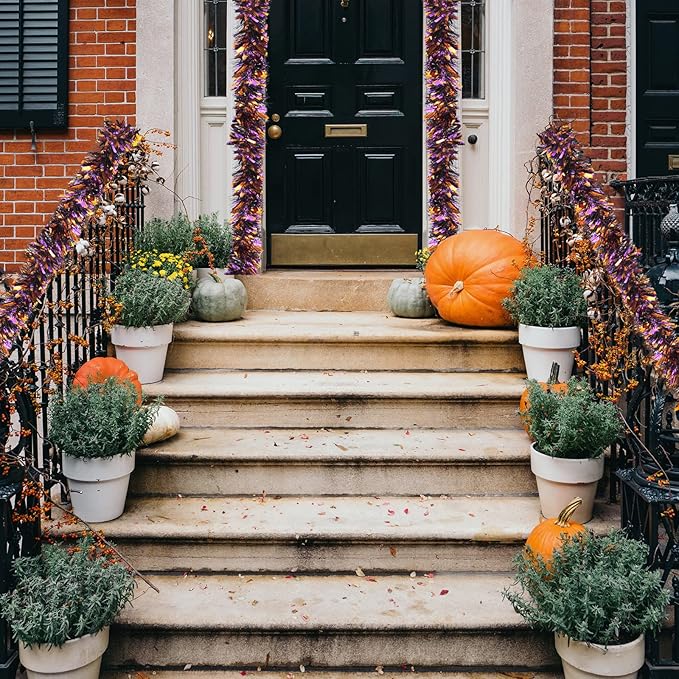 - FESTIVAL THEME: These Halloween tinsel garlands are designed in classic black, orange and purple colors, cater to the theme of Halloween, beautiful and shiny appearance, bring happy festival atmosphere, leave you unforgettable memory