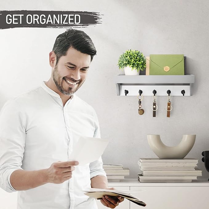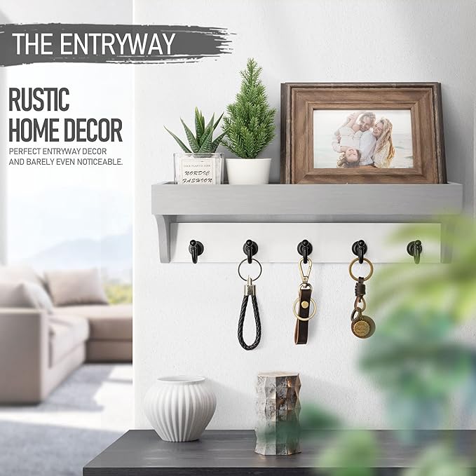 - 【UPGRADED ORGANIZE】Wooden entryway keys storage make the most of your wall space, diaplay top shelf and 5 hooks help you organize small items such as keys, mails, masks, magazines, newspapers, bills, wallets, glasses, umbrellas, hats, belts, pet leashes etc.
