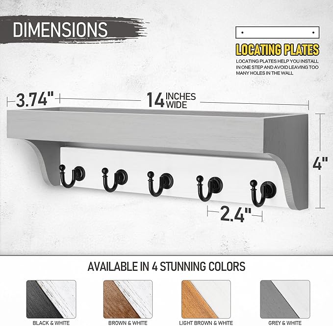 - 【UNIQUE DESIGNED】Unique two-color design design, black and white matching keys hangers for wall made use of high-quality solid wood with 5 vintage durable brass hooks. Strict control of raw materials and clever design enable the shelf to find a perfect balance between weight and load bearing. The wood plank retains the beautiful natural wood grain, unique is simple and suitable for all family decoration style.