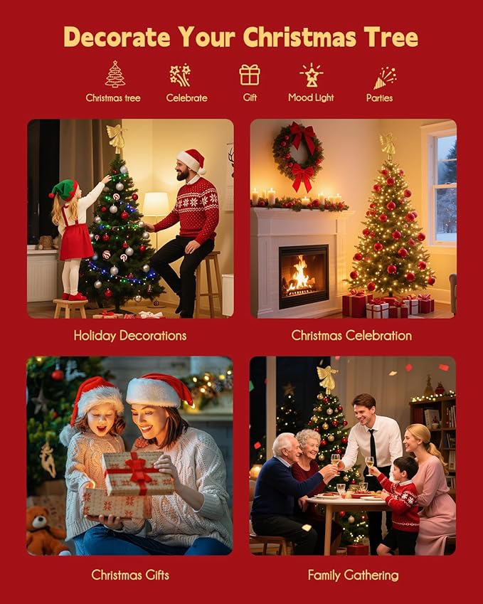 - Gold topper: 9.8”hollowed Angel lighted tree topper with 7.8 Ft lead cord, an appropriate size with beautiful shiny appearance, which makes it more charming in day and night showing, coming with gift box, an ideal and considerable Xmas decorations gift for family, relatives, friends, or colleagues