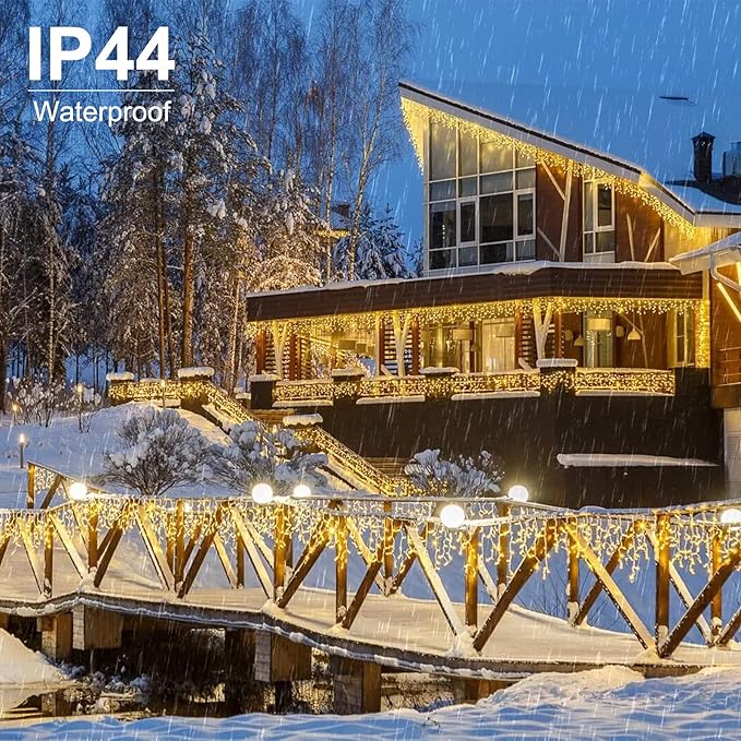 - 【Safe Use & Waterproof for outdoor use】This Christmas icicle lights outdoor with 30 volts operating and 0.3 ampere, will not overheat even after working for a long time and safe to touch. In addition, IP44 waterproof, it makes the icicle lights can be used in outside like trees, roof, front door, eave, etc. Please kindly note: The AC adapter should be protected from rain when using outdoor.