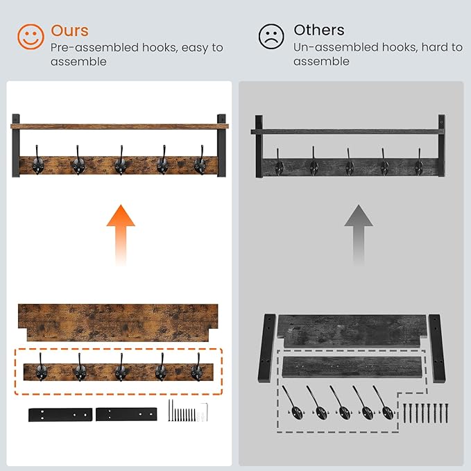 - QUICK AND EASY TO ASSEMBLE: Come with durable screws, anchors and easy-to-understand instruction, pre- drilled holes for mounting brackets, the coat hook shelf can be easily assembled and firmly put in the wall