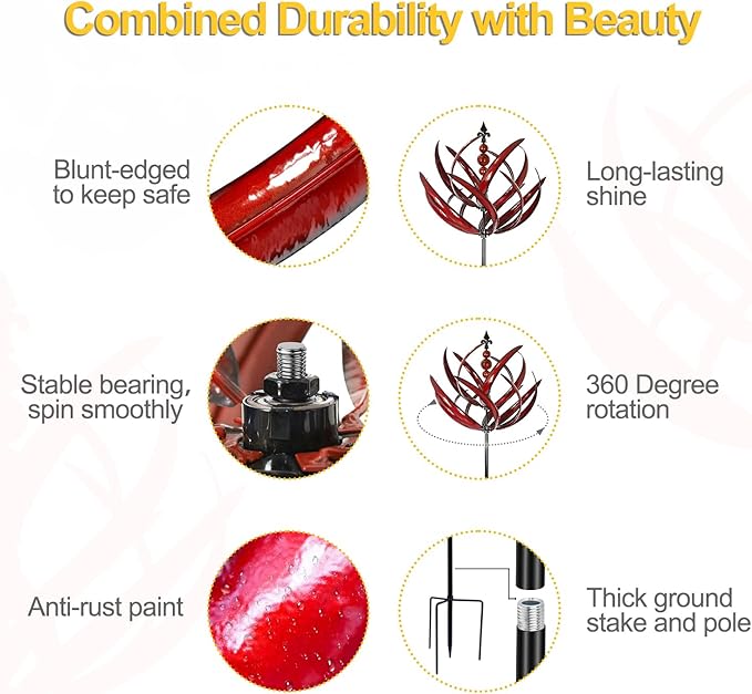 - 【Withstand All Weather】Stable pronged base stake design to keep the spinner balanced and firmly placed under heavy winds. With bright and long-lasting anti-rust paint, our kinetic wind spinners is good for outdoor use