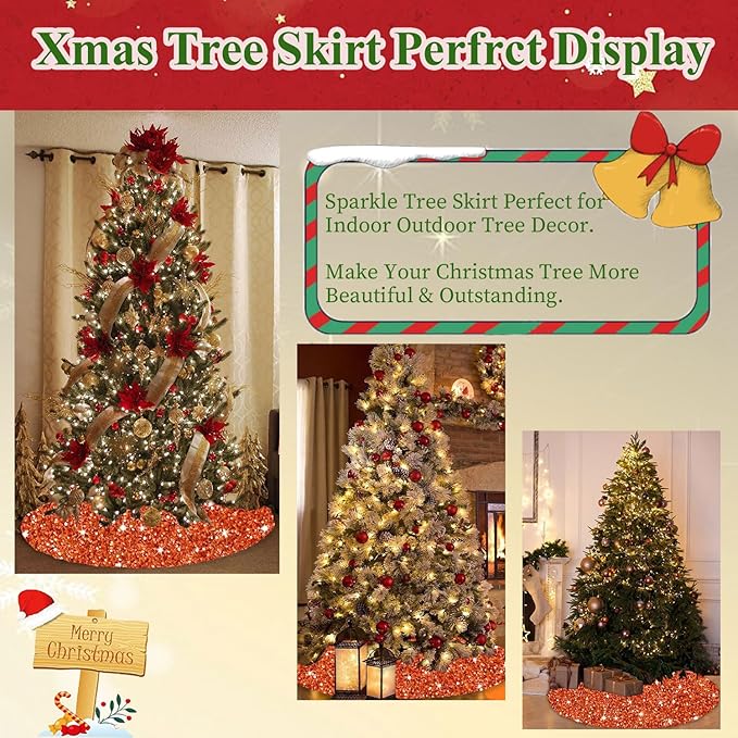 - ❄️【Size Detail - Orange Tree Skirt】You will receive a 36 inches diameter burnt orange glitter sequins tree skirt, fits under 6 foot tall trees. You can put some gifts, Christmas boxes, Christmas ball on the xmas tree cover mat. The sparkle velour Christmas tree skirts is perfect for decorating your home and become part of your holiday tradition.