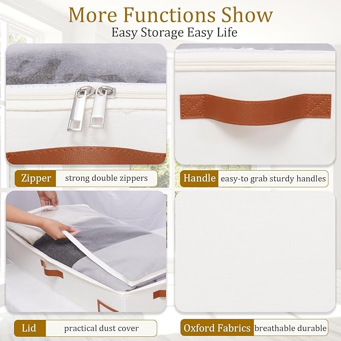 Yawinhe Under Bed Storage Containers, 4 Pack, Bin with Lids, Collapsible Closet Organizers, with Sorting Card Slot and 4 Leather Handles, for Blanket, Bedding, 31.5''Lx15.7''Wx6''H, Beige
