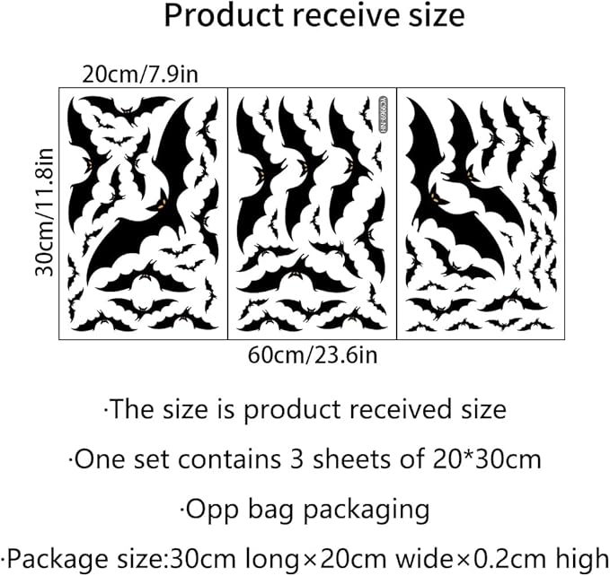 - Package Contents: You will receive 3 Halloween glow-in-the-dark bat stickers measuring 7.9*11.8inch, with different sizes and shapes of bats, sufficient quantity and various patterns to meet your Halloween decoration needs