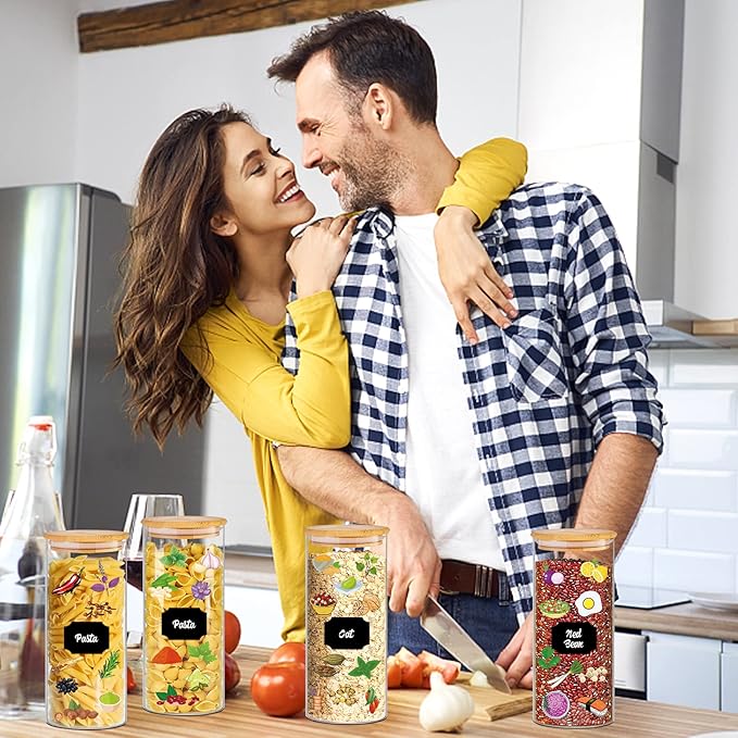 - 【Effortless Organization】Stay perfectly organized with 58 colorful labels included with these kitchen jars. The 【uniform airtight glass pantry storage containers set with bamboo lids stack neatly to maximize space - ideal for small kitchens storing flour, nuts or pet treats.