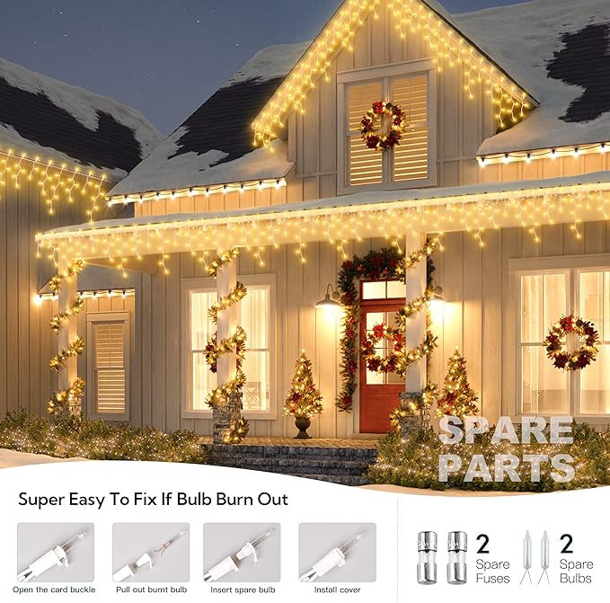 - ⛄*Connectable & Dependable*-Each icicle string light comes with end-to-end plug,allows up 5 strands(1000 lights) extendable to customize your need for larger range lighting and festival decorations.Each bulb works individually, if one broken or removed the rest will stay lit.Extra 2 bulbs and 2 fuses replacement.