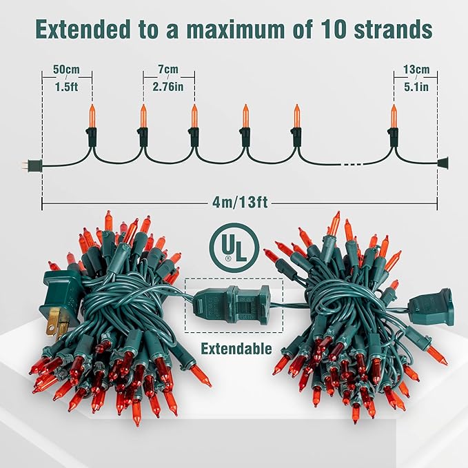 - ๐Incandescent Orange Mini Lights:Beewin orange old-fashion incandescent Christmas lights, 2PACK 50 count 13ft green wire clear lights string set,each bulb space 2.76in,built-in 3A fuse for safe use.Best choice for Halloween decoration.Extra 4 bulbs and 4 fuses included.