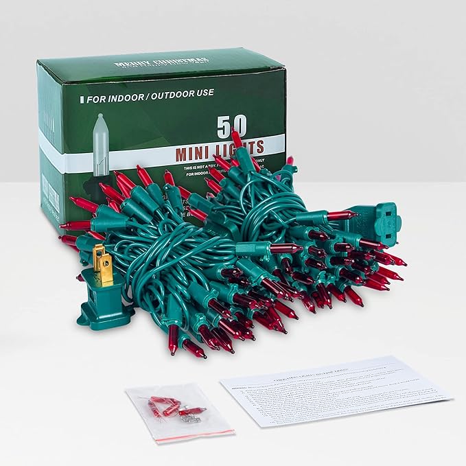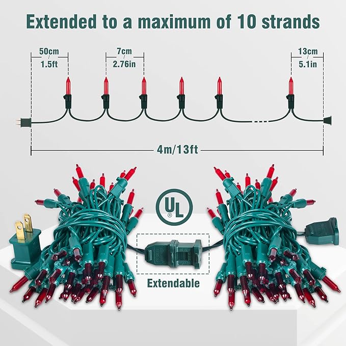 - ๐Connectable Christmas Lights Red:Beewin 2pack red Christmas mini lights,each string of Christmas lights has 13ft green wire length and 50 incandescent bulbs are each spaced 2.76 inches(7cm) apart.Up to 10 string of lights connectable, which will make you get 130 feet 500 lights to customize your need for large area decorations.