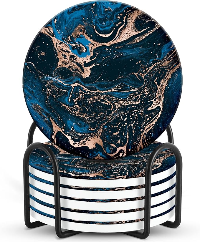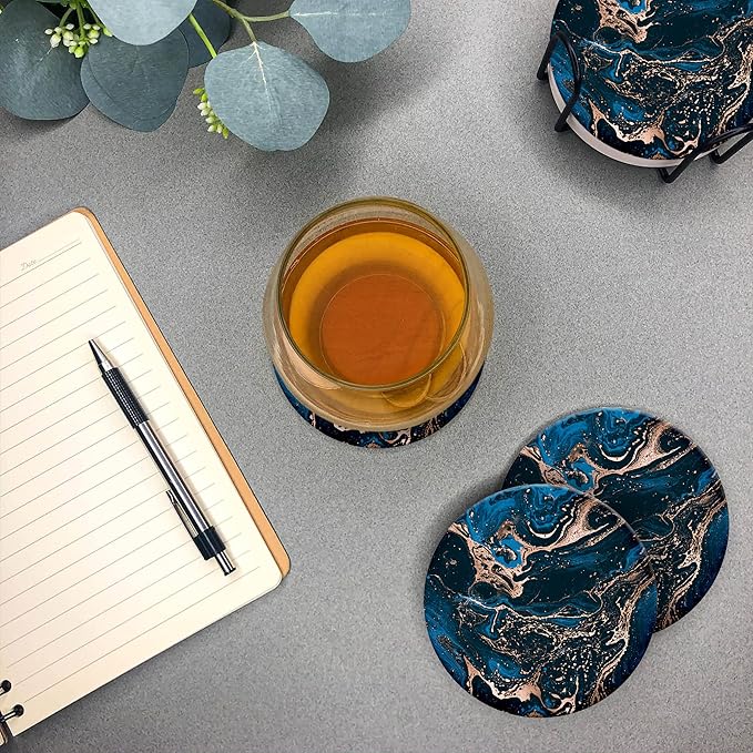 Emerson Coasters for Drinks Absorbent – Natural Stone Drink Coasters Set with Holder, Coasters for Coffee Table, Wooden Tabletop Protection Marble Style – 100% Heavy Duty Set of 6 (Royal)