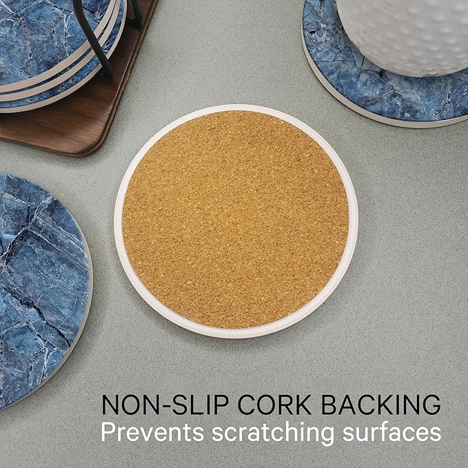 - FULL COMPREHENSIVE PROTECTION – The stone coasters feature non-slip durable cork backing to protect countertops and desks from scratches even from thirsty drinkers! The non-sticky corked backing base helps the coasters stay in place and prevents scratching your glass or wooden countertop tables.