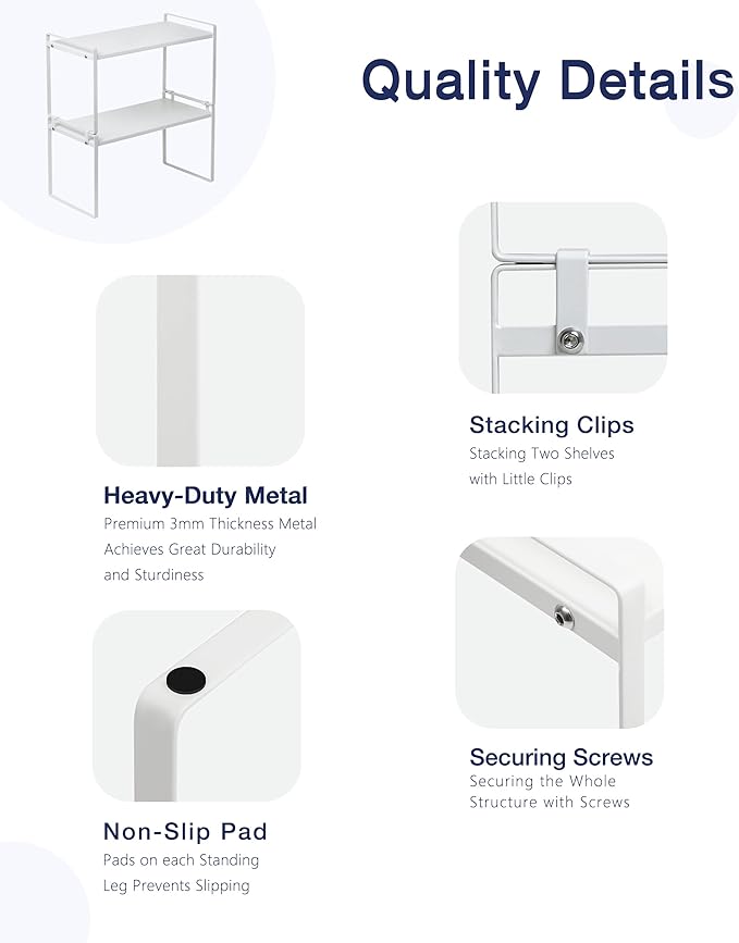 - STACKABLE: The product comes with two sets of cabinet shelves where you can stack one on top of another, creating 2-tiers double space to store household items under, in between or on the shelf. They are perfect to use as storage organizers in kitchen, cabinet, pantry, cupboard, and anywhere in your home or office for that wonderful extra storage space.