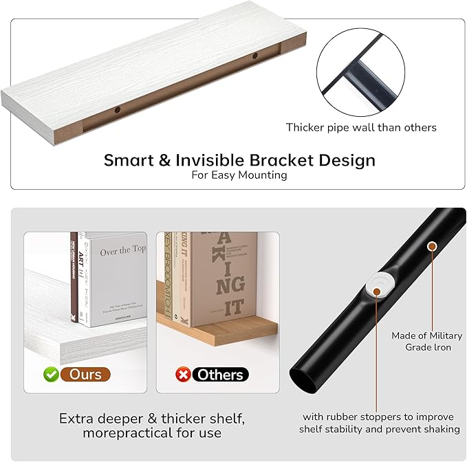 - Extra Deeper & Thicker - This wall shelf measures 36"W x 10.23"D x 1.8"H. Extra deeper and thicker design in order to bring maximizes storage space and weight capacity, even hold up to 70 lb. This floating shelf taking up zero square feet, reduces clutter and highlights décor in compact spaces.