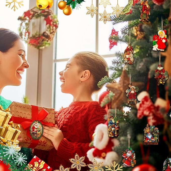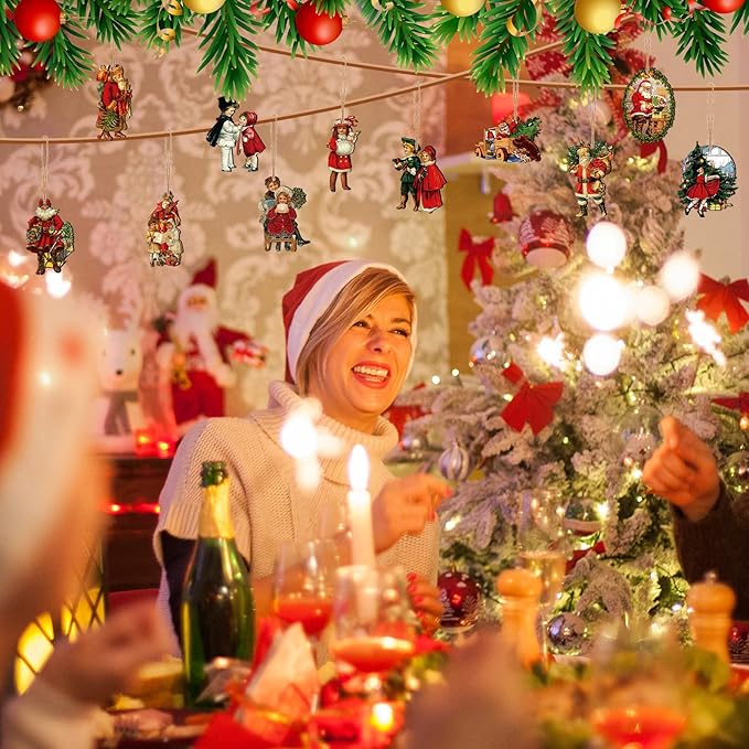48 Pcs Vintage Wood Ornaments - Victorian Style Santa Claus, Snowman & Retro Decor for Christmas Trees