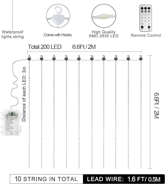 - [Remote Control] The curtain light with memory function is equipped with a multi-function remote control with 12 lighting modes, 3 timing and 4 brightness adjustments