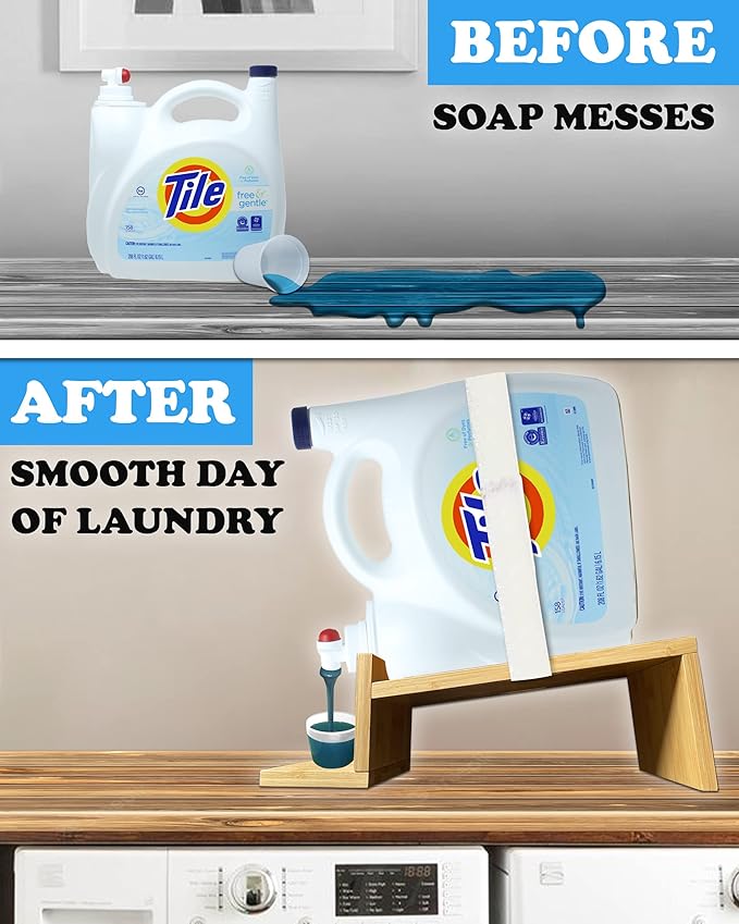 - [MATERIAL] - This wood liquid laundry detergent cup holder & drip tray catcher is made of bamboo material that is natural and environmentally friendly. The wood detergent dispenser for the laundry room has been especially waterproof treatment, with no need to worry about molds, and can easily be washed with clean water. This wood detergent drip catcher also has a loading capacity of 130lb well-made for a heavy bottle.