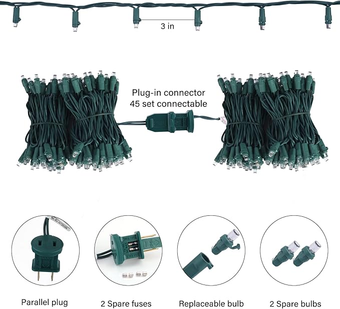 - 【Extensible End-to-End Connection】The total length of 26.5 feet of LED lights allows you to connect up to 45 groups (4500 lights) end-to-end, if one of the strings burns out, the rest of the strings remain on, for extra peace of mind, each light string comes with extra bulbs and replacement fuses, so you don't have to worry about burning out or overloading your bulbs. Note: The AC plug is not waterproof, it should be protected from the rainy day