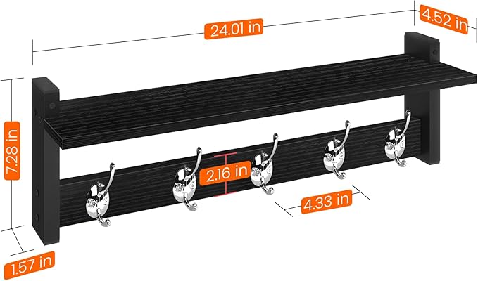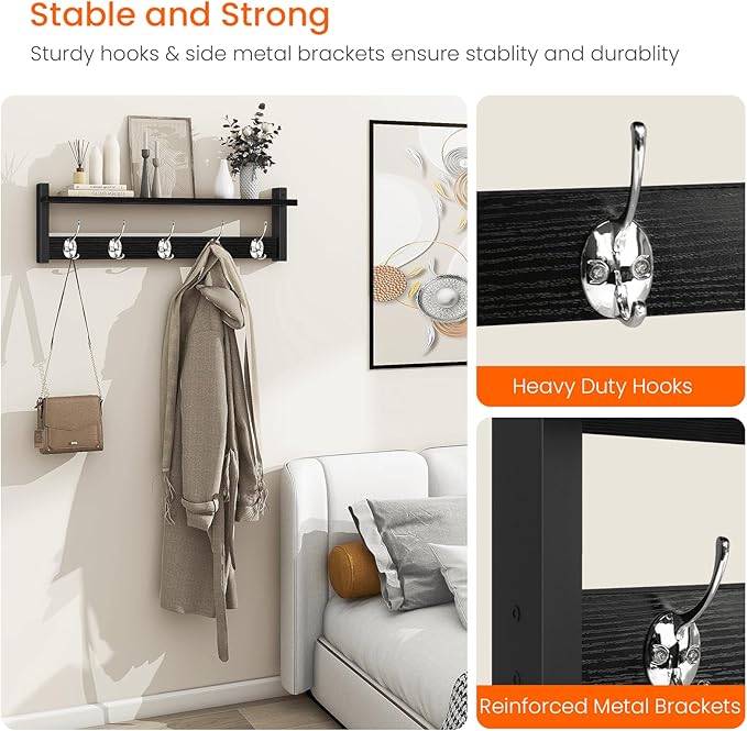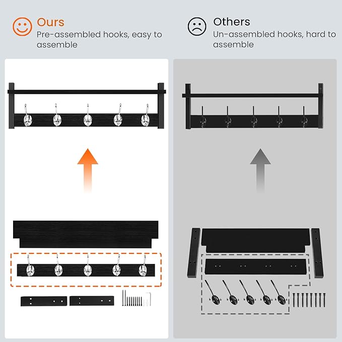 - QUICK AND EASY TO ASSEMBLE: Come with durable screws, anchors and easy-to-understand instruction, pre- drilled holes for mounting brackets, 5 hooks assembled on rail before package, the coat hook shelf can be easily installed to the wall firmly