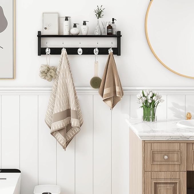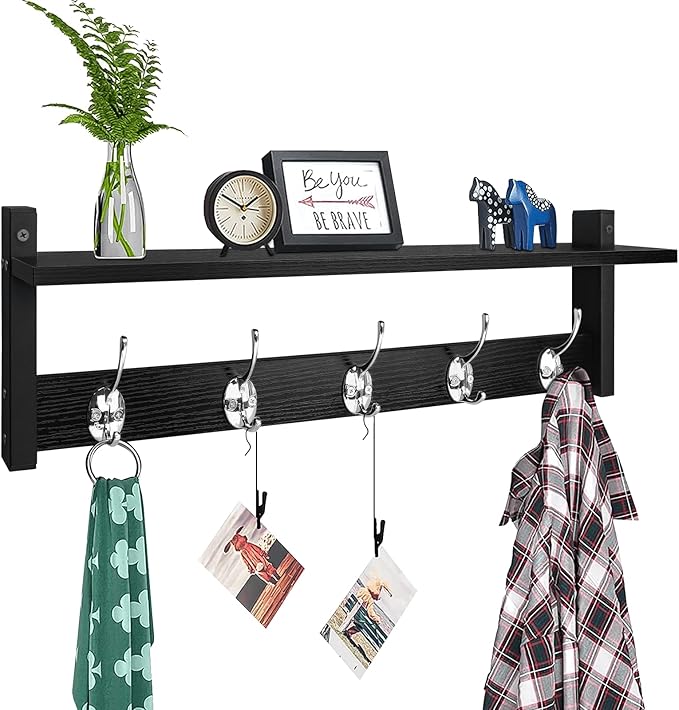 Homode Coat Rack Wall Mount with Shelf, 24" Long Entryway Shelf with Hooks Underneath, Wooden Coat Hanger for Hanging Hats, Bathroom Towels, Clothes, Black