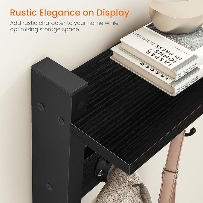 - MATCHE THE AESTHETIC: Black oak finish particleboard with polished chrome hooks for a modern look, rigid black iron for industrial chic style, they now come together on this shelf with hooks to bring a elegant style, which makes it a welcome addition in your living room, entryway, or office