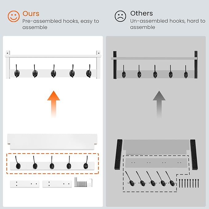 - QUICK AND EASY TO ASSEMBLE: Come with durable screws, anchors and easy-to-understand instruction, pre- drilled holes for mounting brackets, 5 hooks assembled on rail before package, the coat hook shelf can be easily installed to the wall firmly