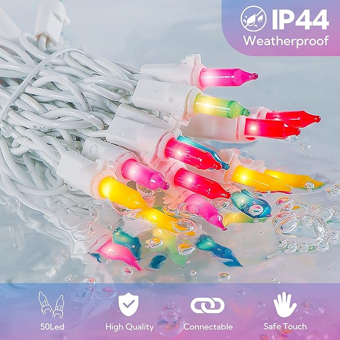 - ๐ฒSafe to Use : 50count Multicolor Christmas string lights are UL certified and the quality is guaranteed. Our Christmas string lights have built-in fuses๏ผ which will protect the short circuit caused by the damaged wire and can effectively prevent the possibility of fire. High quality use rest assured. Warm tips: Please kindly protect these string lights from immersing in water and keep the plug dry.