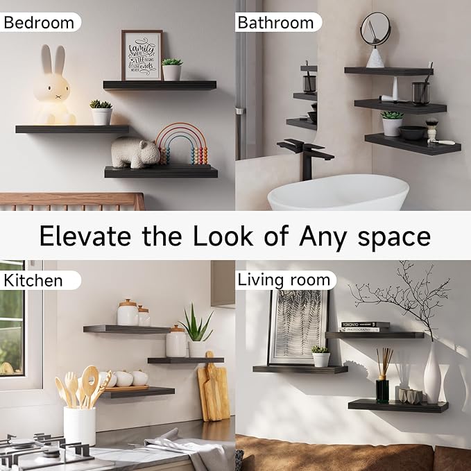 BAYKA Floating Shelves for Wall, Wall Mounted Rustic Wood Shelves for Bathroom, Bedroom, Living Room, Kitchen, Hanging Shelf for Books/Storage/Room Decor with 22lbs Capacity (Black, Set of 3, 15.7in)