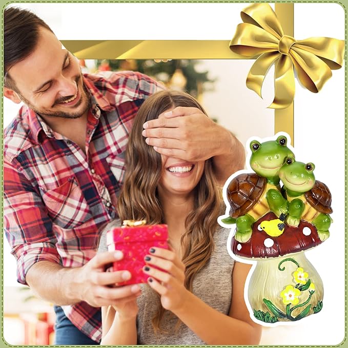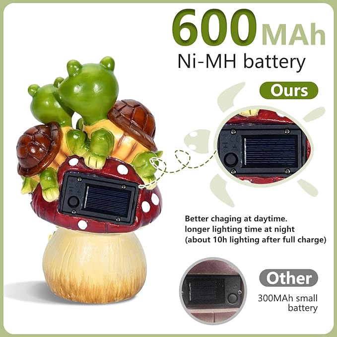 - Attractive Large Mushroom with Lovely Turtles: This 9-inch tall solar mushroom garden statue catches all the attention, no matter where you place it. Warming up your garden and your life