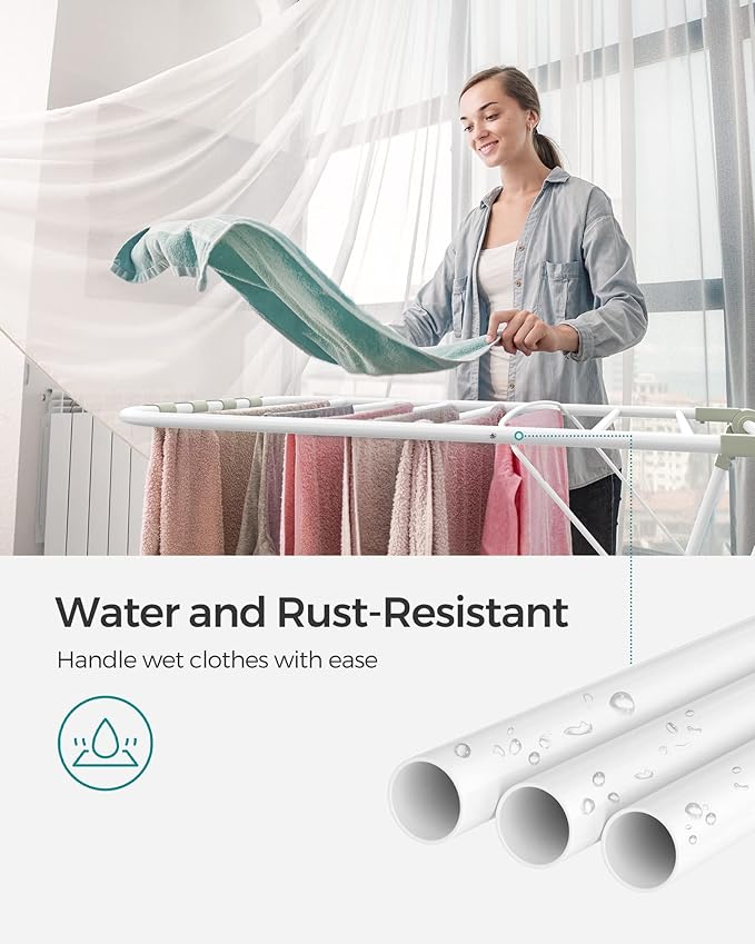 SONGMICS Clothes Drying Rack, with Sock Clips, Metal Laundry Rack, Foldable, Space-Saving, Free-Standing Airer, with 2 Height-Adjustable Gullwings, Indoor Outdoor Use, White and Green ULLR052C01