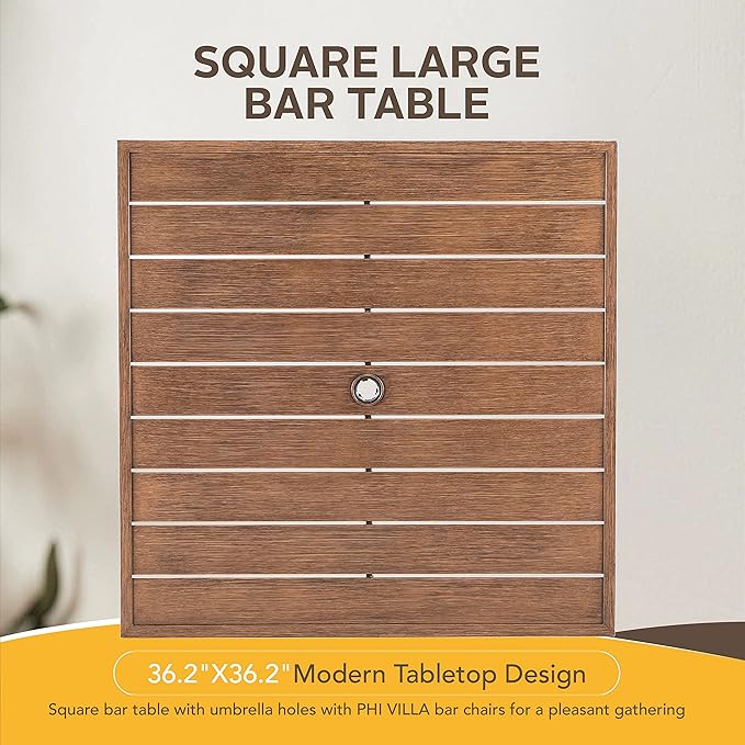 PHI VILLA 36"X36" Outdoor Metal Counter Height Table with 1.57" Umbrella Hole, Square Table with Teakwood-Brown Table Top and Black Table Legs for Outdoor and Indoor